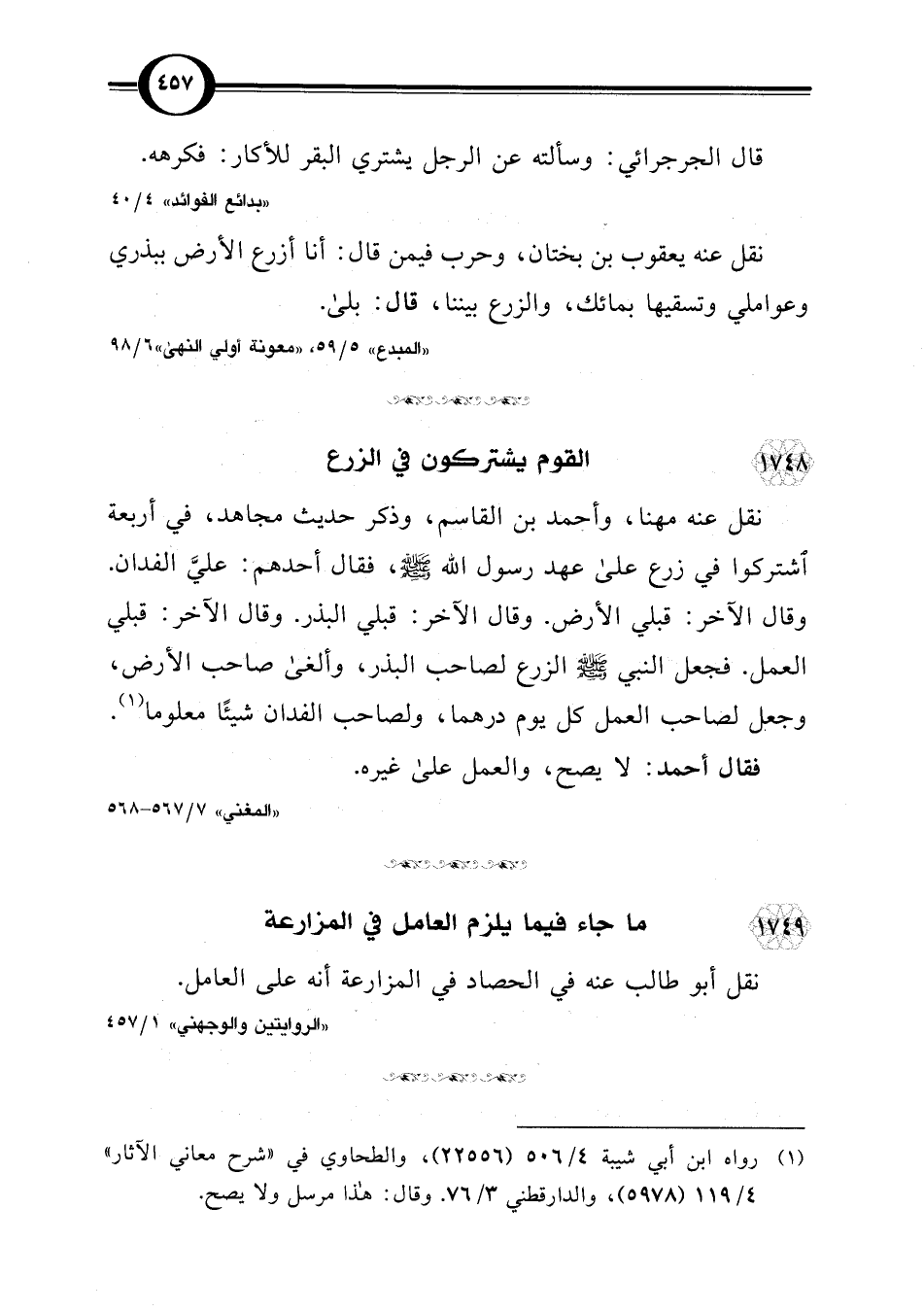 نقل عنه مهنا، وأَحمد بن القاسم، وذكر حديث مجاهد، في أربعة اشتركوا في زرع على عهد رسول اللَّه -صلى اللَّه عليه وسلم-، فقال أحدهم: عليَّ الفدان. وقال الآخر: قبلي الأرض. وقال الآخر: قبلي البذر. وقال الآخر: قبلي العمل. فجعل النبي -صلى اللَّه عليه وسلم- الزرع لصاحب البذر، وألغى صاحب الأرض، وجعل لصاحب العمل كل يوم درهما, ولصاحب الفدان شيئًا معلومًا (¬1).