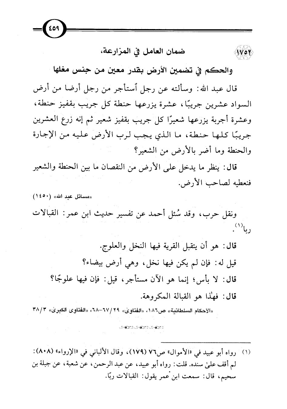 (¬1) رواه أبو عبيد في "الأموال" ص 76 (179)، وقال الألباني في "الإرواء" (808): لم أقف على سنده. قلت رواه أبو عبيد، عن عبد الرحمن، عن شعبة، عن جبلة بن سحيم، قال: سمعت ابن عمر يقول: القبالات ربًا.