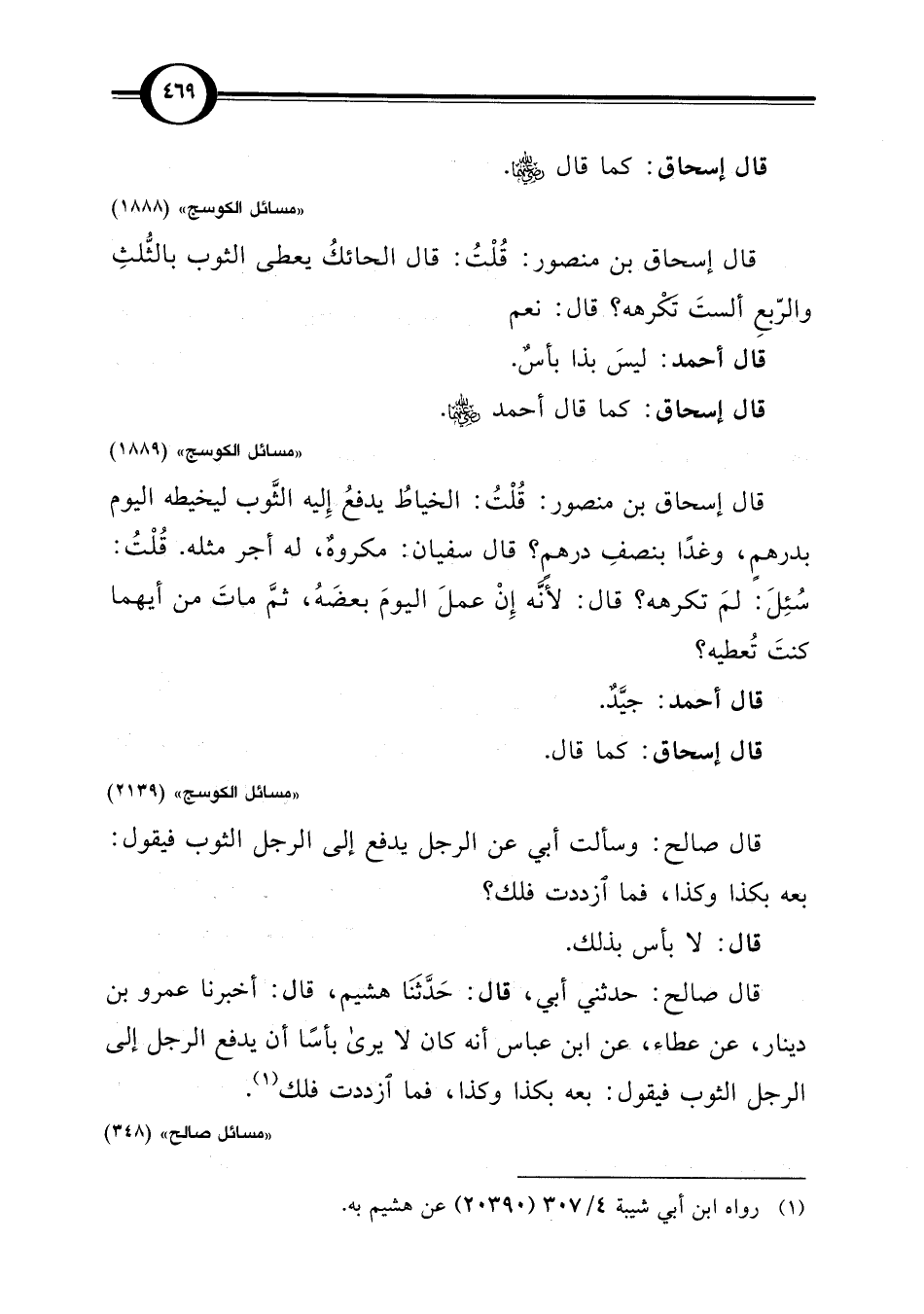 قال إسحاق بن منصور: قُلْتُ: قال الحائكُ يعطى الثوب بالثُّلثِ والرّبعِ ألستَ تكْرهه؟ قال: نعم