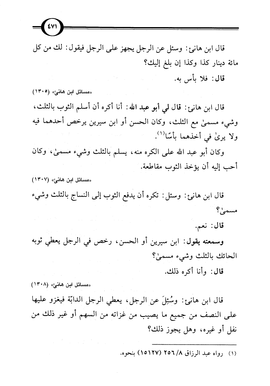 قال ابن هانئ: وسُئِلَ عن الرجل، يعطي الرجل الدابّة فيغزو عليها على النصف من جميع ما يصيب من غزاته من السهم أو غير ذلك من نفل أو غيره، وهل يجوز ذلك؟