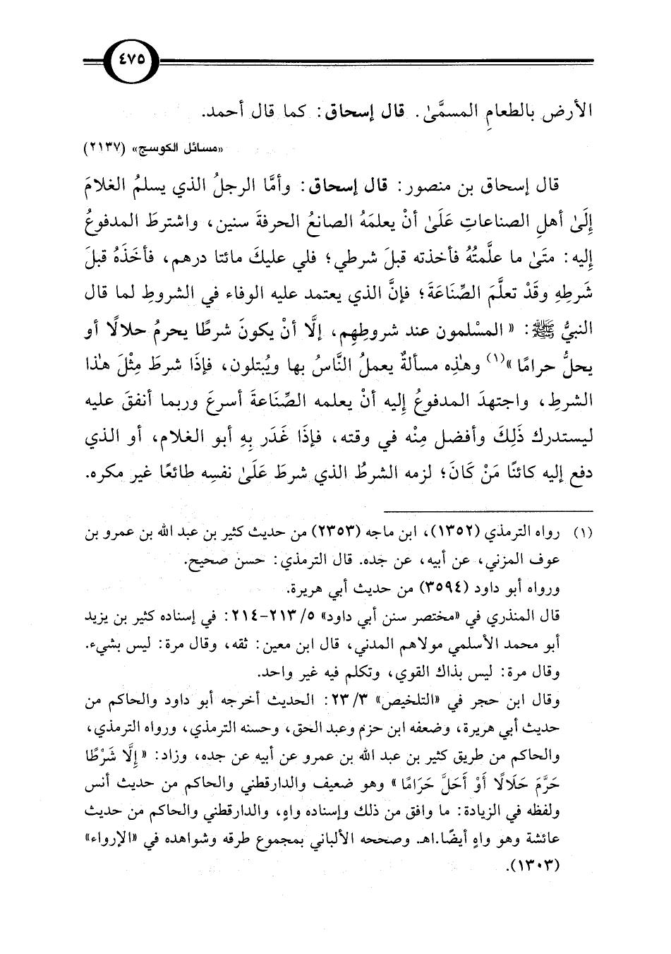 قال إسحاق بن منصور: قال إسحاق: وأمَّا الرجلُ الذي يسلمُ الغلامَ إلى أهلِ الصناعاتِ عَلَى أنْ يعلمَهُ الصانعُ الحرفةَ سنين، واشترطَ المدفوعُ إِليه: متَى ما علَّمتُهُ فأخذته قبلَ شرطي؛ فلي عليكَ مائتا درهم، فأخَذَهُ قبلَ شَرطِهِ وقَدْ تعلَّمَ الصِّنَاعَةَ؛ فإنَّ الذي يعتمد عليه الوفاء في الشروطِ لما قال النبيُّ -صلى اللَّه عليه وسلم-: "المسْلمون عند شروطِهِم، إلَّا أنْ يكونَ شرطًا يحرمُ حلالًا أو يحلُّ حرامًا" (¬1) وهذِه مسألةٌ يعملُ النَّاسُ بها ويُبتلون، فإذَا شرطَ مِثْلَ هذا الشرطِ، واجتهدَ المدفوعُ إِليه أنْ يعلمه الصِّنَاعةَ أسرعَ وربما أنفقَ عليه ليستدرك ذَلِكَ وأفضل مِنْه في وقته، فإذَا غَدَر بِهِ أبو الغلام، أو الذي دفع إليه كائنًا مَنْ كَانَ؛ لزمه الشرُ الذي شرط عَلَى نفسِه طائعًا غير مكره.