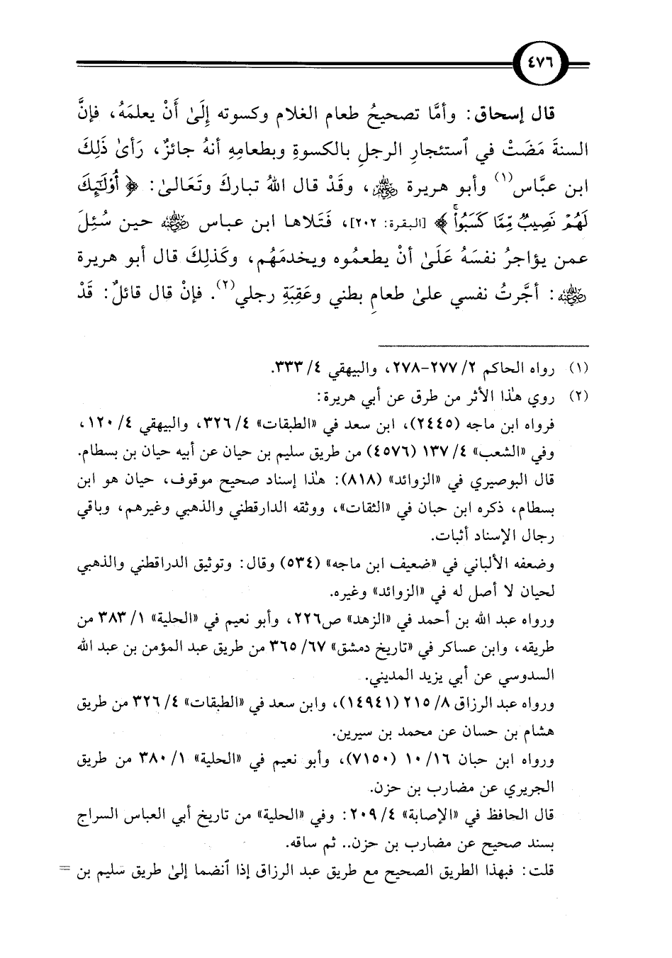 قال إسحاق: وأمَّا تصحيحُ طعام الغلام وكسوته إِلَى أَنْ يعلمَهُ، فإنَّ السنةَ مَضَتْ في استئجارِ الرجلِ بالكسوةِ وبطعامِهِ أنهُ جائزٌ، رَأى ذَلِكَ ابن عبَّاس (¬1) وأبو هريرة -رضي اللَّه عنه-، وقَدْ قال اللَّهُ تباركَ وتَعَالى: {أُولَئِكَ لَهُمْ نَصِيبٌ مِمَّا كَسَبُوا} [البقرة: 202] , فَتَلاها ابن عباس -رضي اللَّه عنه- حين سُئِلَ عمن يؤاجرُ نفسَهُ عَلَى أنْ يطعمُوه ويخدمَهُم، وكَذلِكَ قال أبو هريرة -رضي اللَّه عنه-: أجَّرتُ نفسي على طعامِ بطني وعَقِبَةِ رجلي (¬2). فإنْ قال قائلٌ: قَدْ
