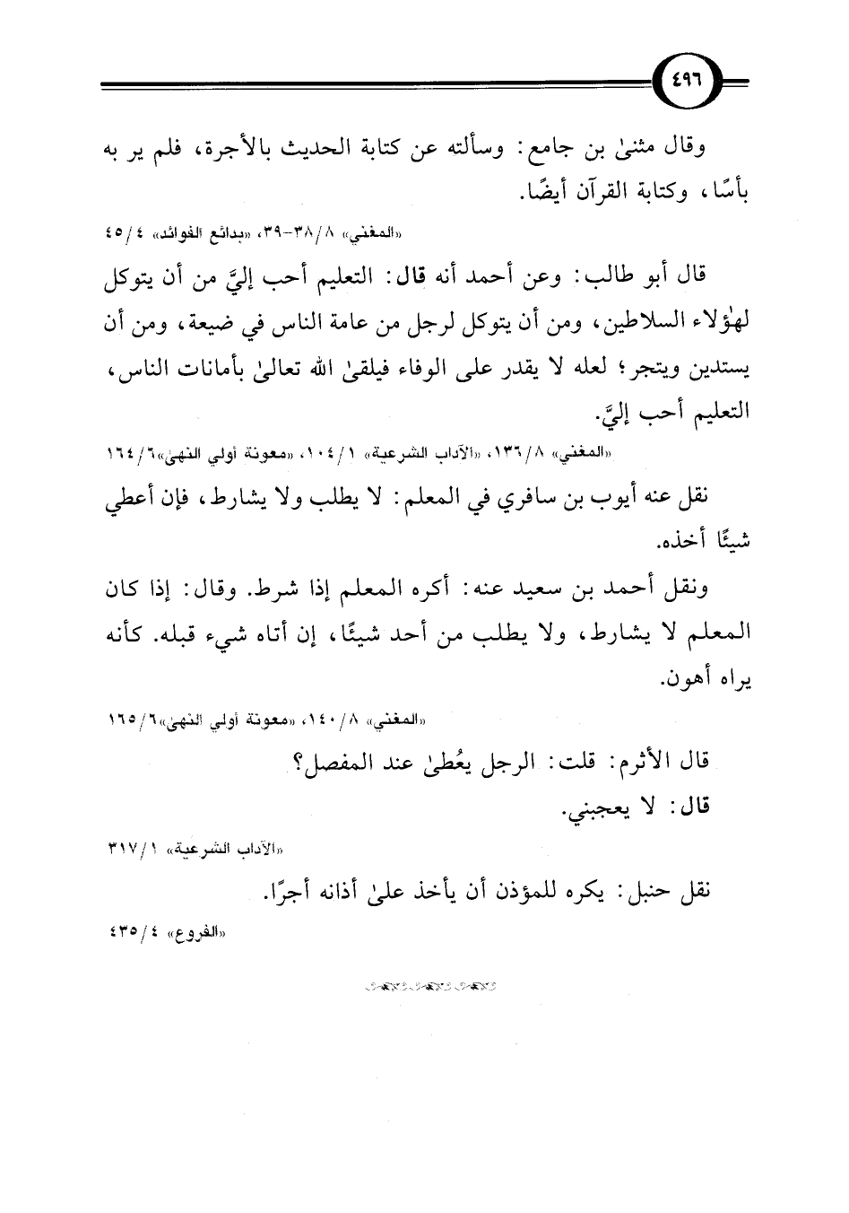 قال أبو طالب: وعن أحمد أنَّه قال: التعليم أحب إليَّ من أن يتوكل لهؤلاء السلاطين، ومن أن يتوكل لرجل من عامة النَّاس في ضيعة، ومن أن يستدين ويتجر؛ لعله لا يقدر على الوفاء فيلقى اللَّه تعالى بأمانات النَّاس، التعليم أحب إليَّ.