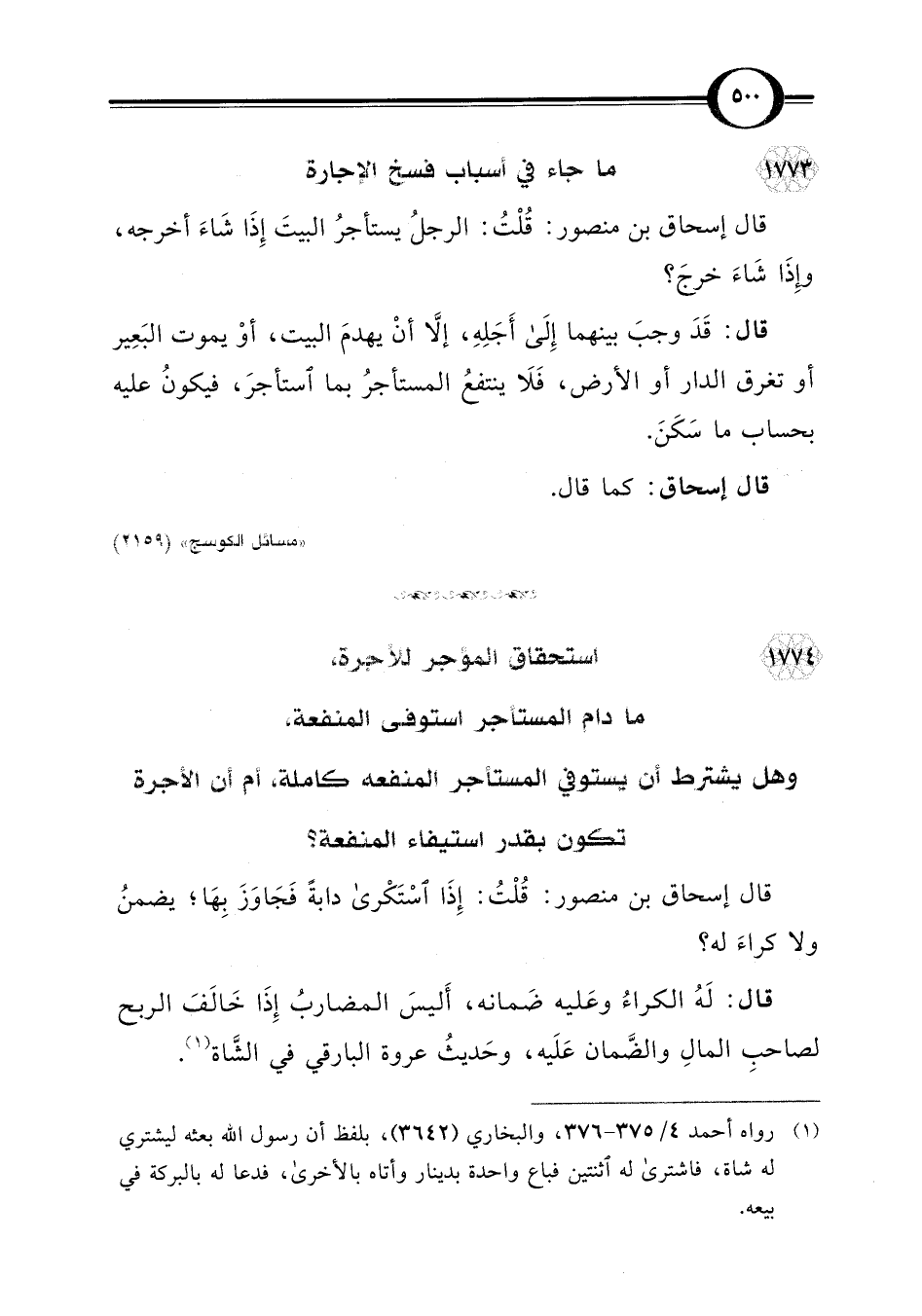 قال إسحاق بن منصور: قُلْتُ: الرجلُ يستأجرُ البيتَ إِذَا شَاءَ أخرجه، وإِذَا شَاءَ خرجَ؟