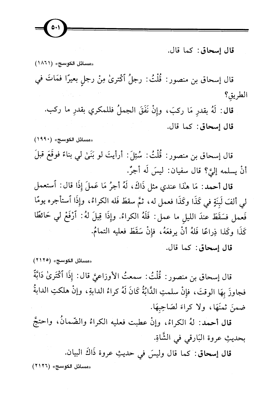 قال إسحاق بن منصور: قُلْتُ: رجلُ اكْترى مِنْ رجلٍ بعيرًا فمَاتَ في الطريقِ؟