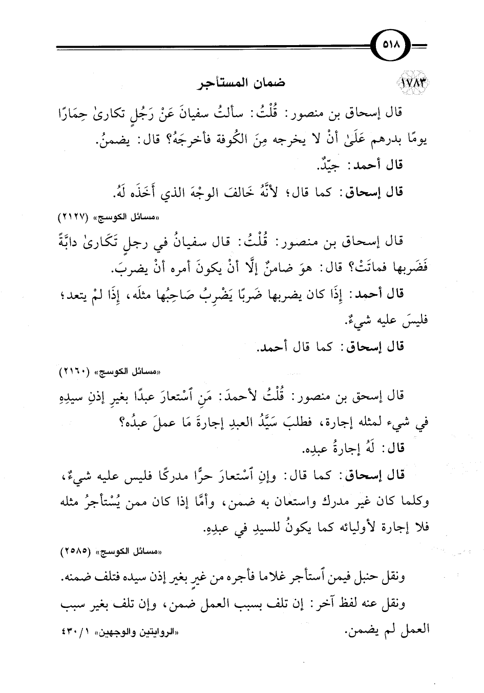 قال إسحاق بن منصور: قُلْتُ: قال سفيانُ في رجلٍ تَكَارى دابَّةً فَضَربها فماتَتْ؟ قال: هوَ ضامنٌ إلَّا أنْ يكونَ أمره أنْ يضربَ.