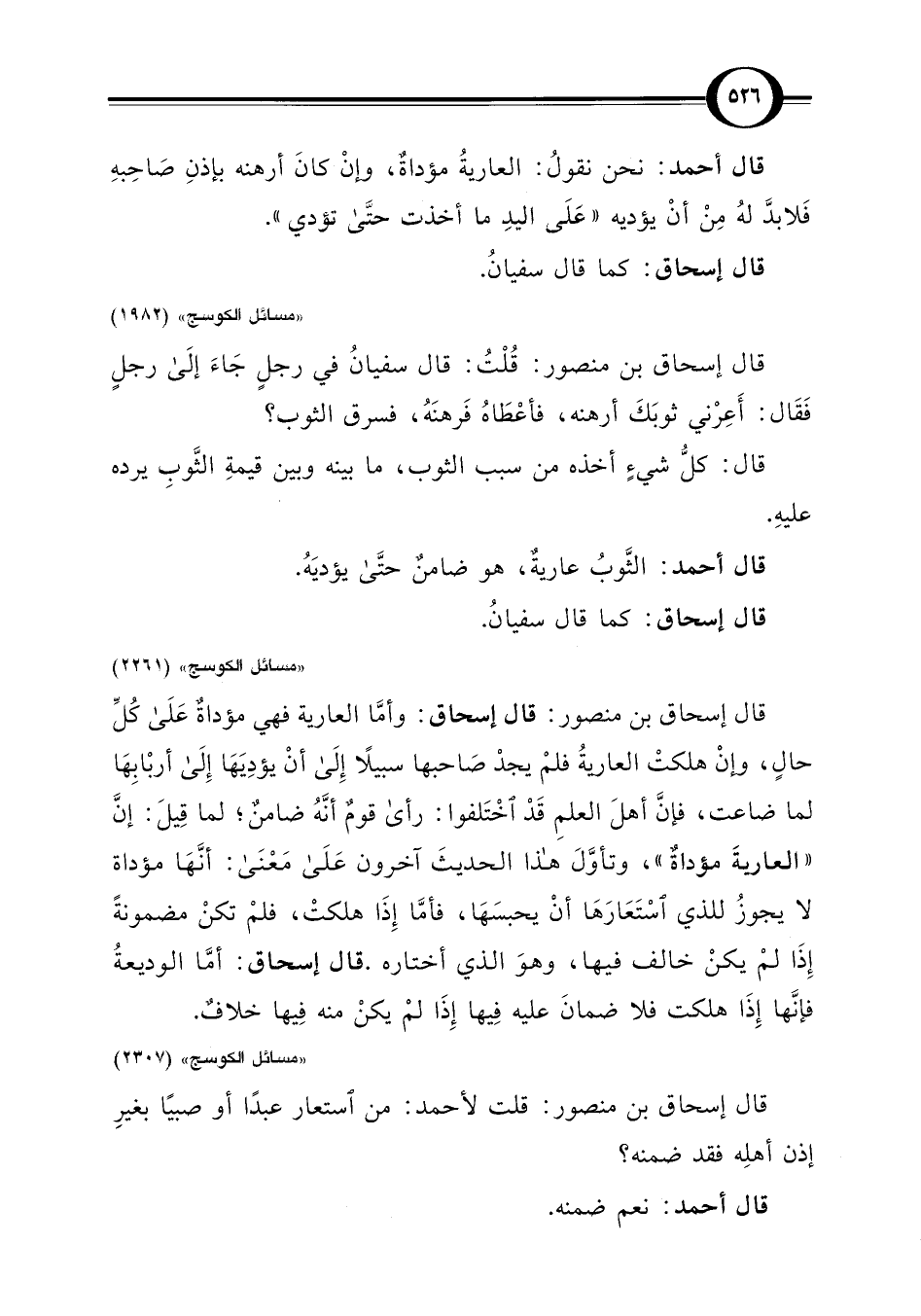 قال إسحاق بن منصور: قال إسحاق: وأمَّا العارية فهي مؤداةٌ عَلَى كُلِّ حالٍ، وإنْ هلكتْ العاريةُ فلمْ يجدْ صاحبها سبيلًا إِلَى أنْ يؤدِيَهَا إِلَى أربْابِهَا لما ضاعت، فإنَّ أهلَ العلمِ قَدْ أخْتَلفوا: رأى قومٌ أنَّهُ ضامنٌ؟ لما قِيلَ: إنَّ "العاريةَ مؤداةٌ"، وتأوَّلَ هذا الحديثَ آخرون عَلَى مَعْنَى: أنَّهَا مؤداة لا يجوزُ للذي اسْتَعَارَهَا أنْ يحبسَهَا، فأمَّا إِذَا هلكتْ، فلمْ تكنْ مضمونةً إِذَا لمْ يكنْ خالف فيها، وهوَ الذي أختاره. قال إسحاق: أمَّا الوديعةُ فإنَّها إِذَا هلكت فلا ضمانَ عليه فِيها إِذَا لمْ يكنْ منه فِيها خلافٌ.