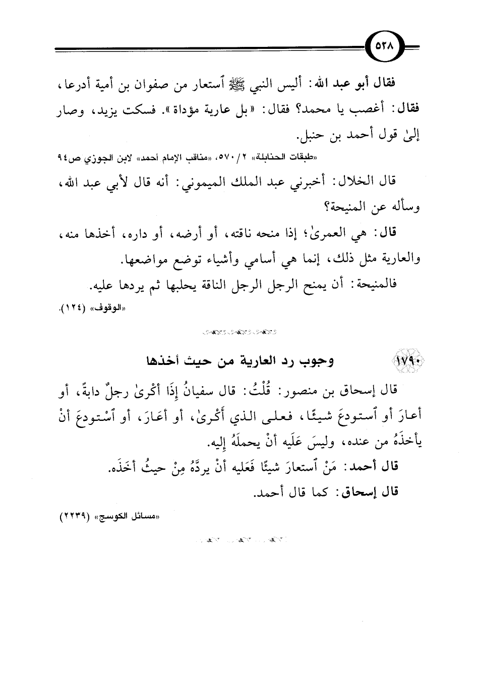 فقال أبو عبد اللَّه: أليس النبي -صلى اللَّه عليه وسلم- أستعار من صفوان بن أمية أدرعا، فقال: أغصب يا محمد؟ فقال: "بل عارية مؤداة". فسكت يزيد، وصار إلى قول أحمد بن حنبل.
