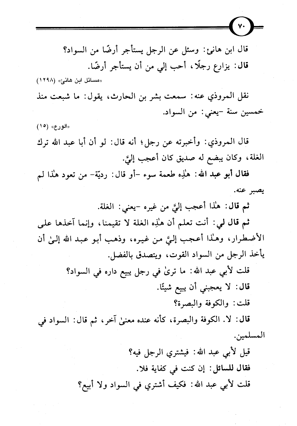 ثم قال لي: أنت تعلم أن هذِه الغلة لا تقيمنا، وإنما آخذها على الاضطرار، وهذا أعجب إليَّ من غيره، وذهب أبو عبد اللَّه إلى أن يأخذ الرجل من السواد القوت، ويتصدق بالفضل.