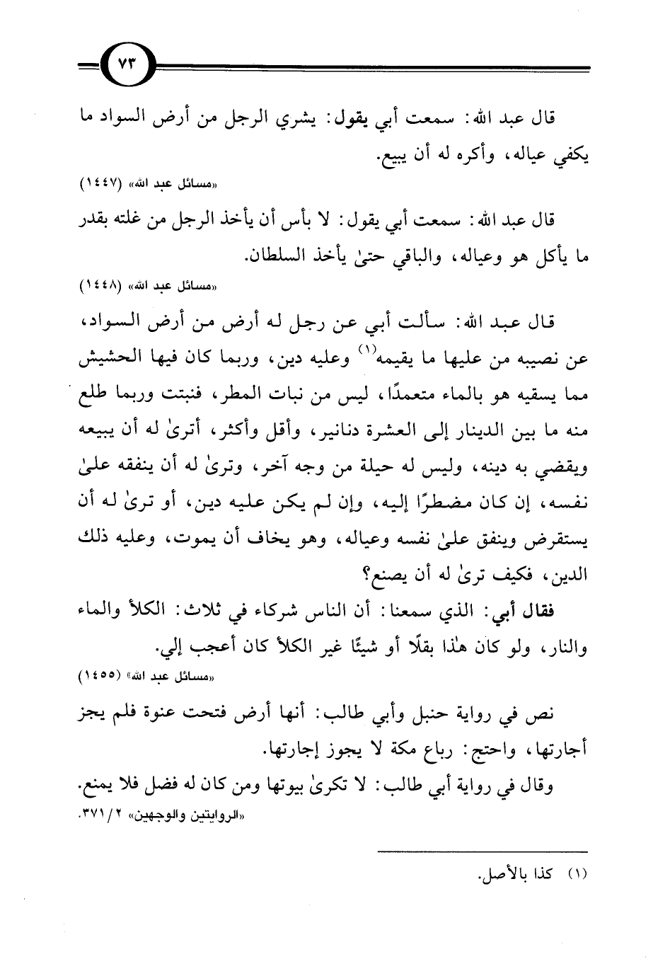 قال عبد اللَّه: سمعت أبي يقول: يشري الرجل من أرض السواد ما يكفي عياله، وأكره له أن يبيع.