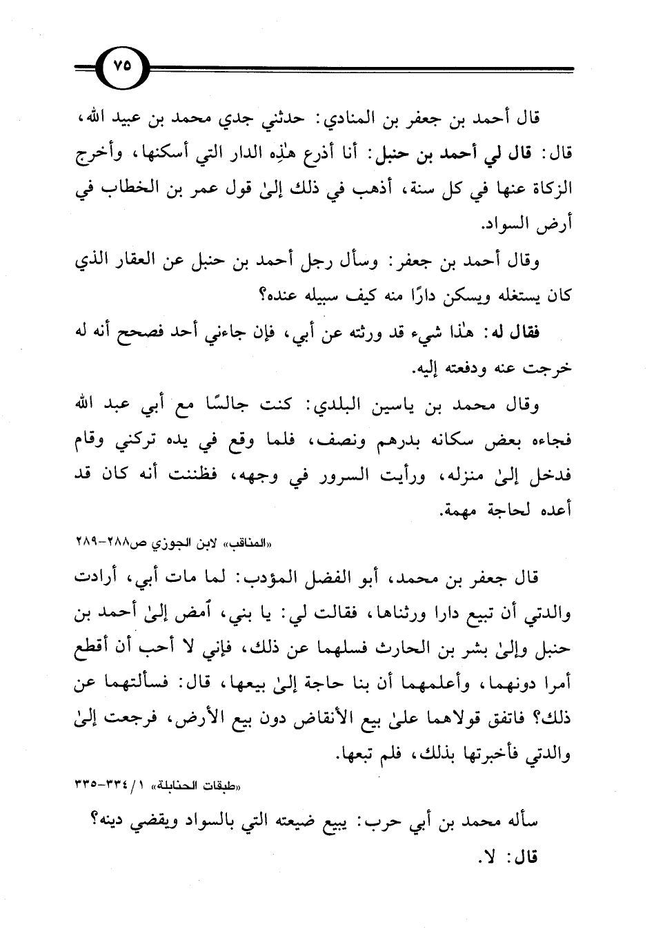 قال أحمد بن جعفر بن المنادي: حدثني جدي محمد بن عبيد اللَّه، قال: قال لي أحمد بن حنبل: أنا أذرع هذِه الدار التي أسكنها، وأخرج الزكاة عنها في كل سنة، أذهب في ذلك إلى قول عمر بن الخطاب في أرض السواد.