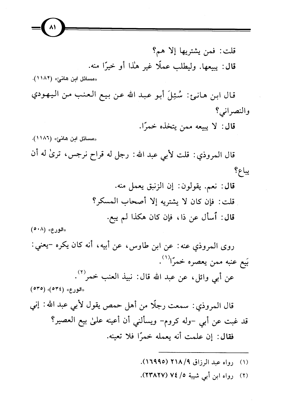 قال المروذي: سمعت رجلًا من أهل حمص يقول لأبي عبد اللَّه: إني قد غبت عن أبي -وله كروم- ويسألني أن أعينه على بيع العصير؟