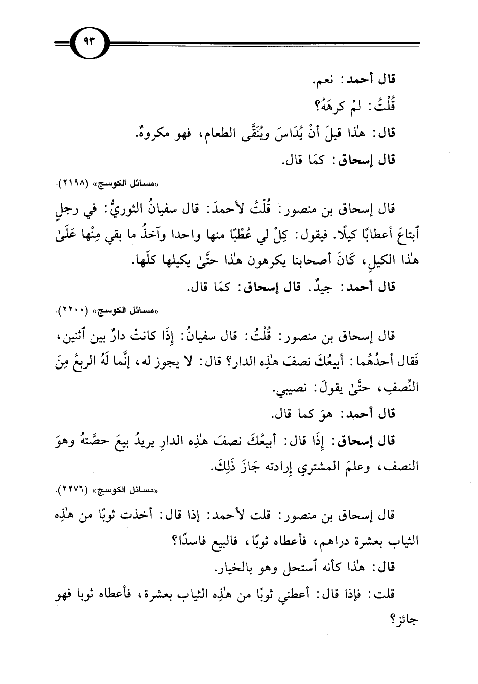 قال إسحاق بن منصور: قُلْتُ: قال سفيانُ: إِذَا كانتْ دارٌ بين اثنين، فَقال أحدُهُما: أبيعُكَ نصفَ هذِه الدار؟ قال: لا يجوز له، إنَّما لَهُ الربعُ مِنَ النّصفِ، حتَّى يقولَ: نصيبي.