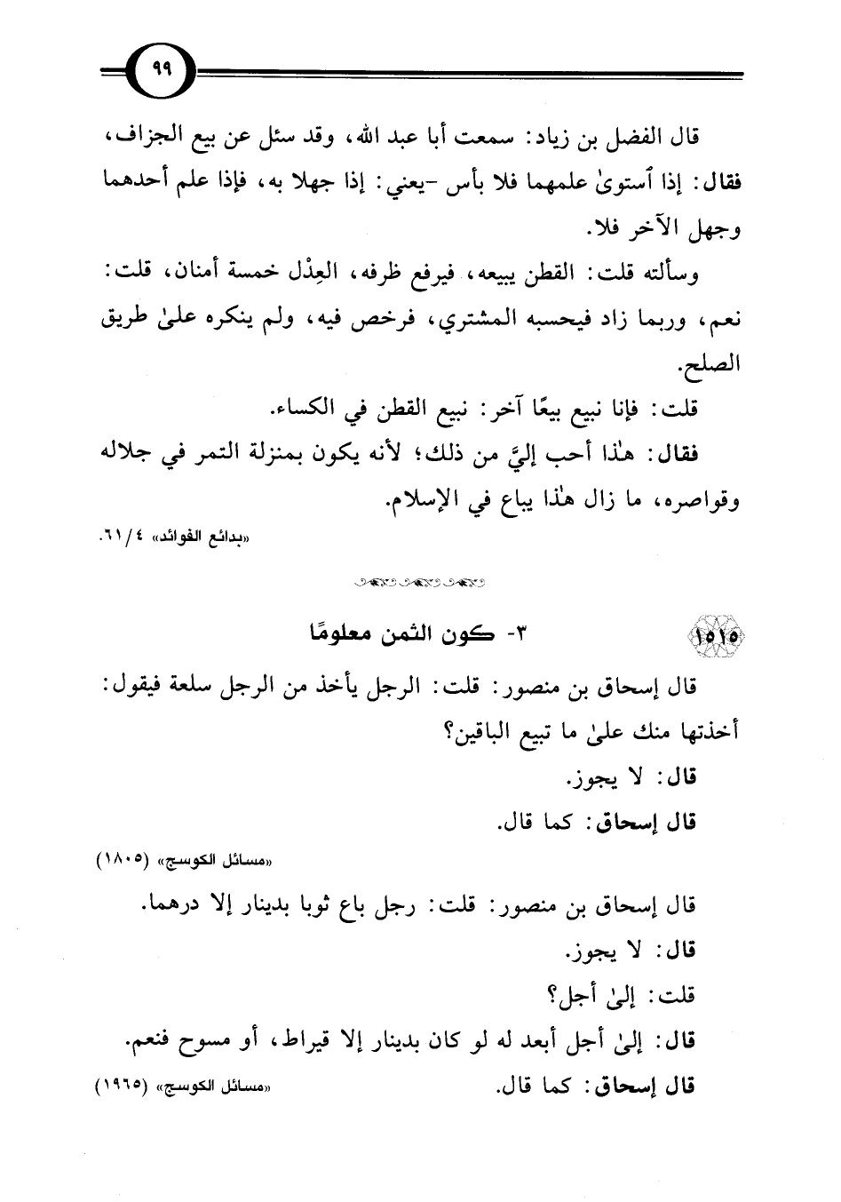 قال الفضل بن زياد: سمعت أبا عبد اللَّه، وقد سئل عن بيع الجزاف، فقال: إذا استوى علمهما فلا بأس -يعني: إذا جهلا به، فإذا علم أحدهما وجهل الآخر فلا.