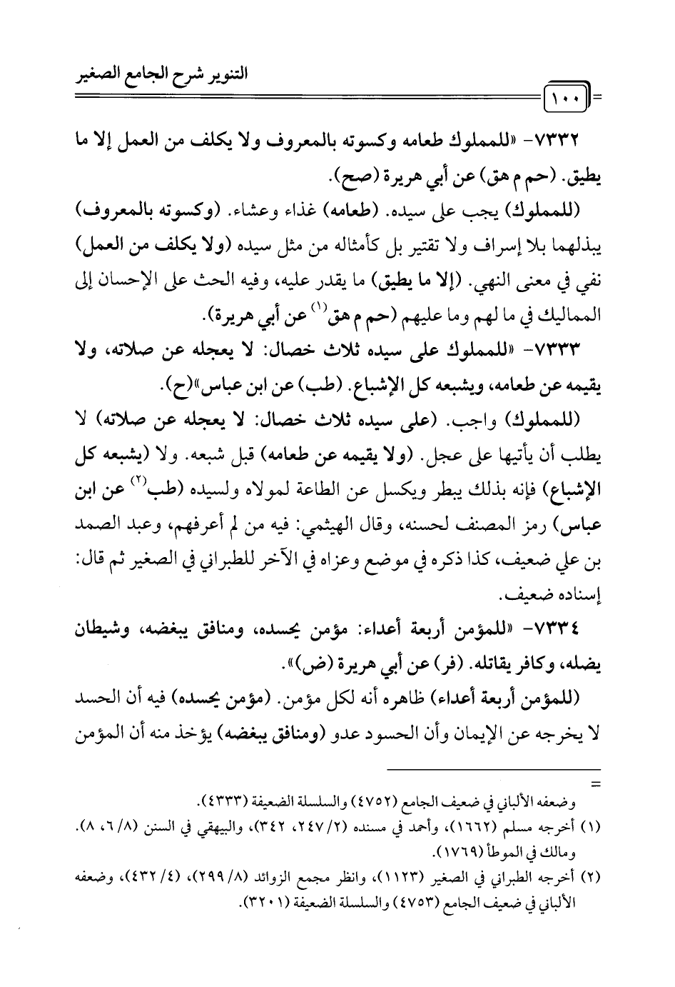 7332 - "للمملوك طعامه وكسوته بالمعروف ولا يكلف من العمل إلا ما يطيق. (حم م هق) عن أبي هريرة (صح).
