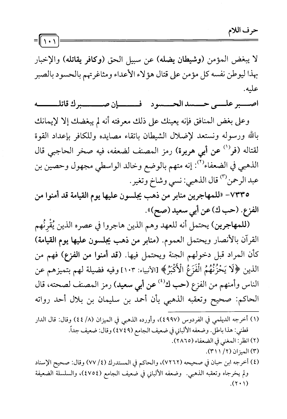 (¬4) أخرجه ابن حبان في صحيحه (7262)، والحاكم في المستدرك (4/ 77) وقال: صحيح الإسناد ولم يخرجاه وتعقبه الذهبي. وضعفه الألباني في ضعيف الجامع (4754)، والسلسلة الضعيفة (201).