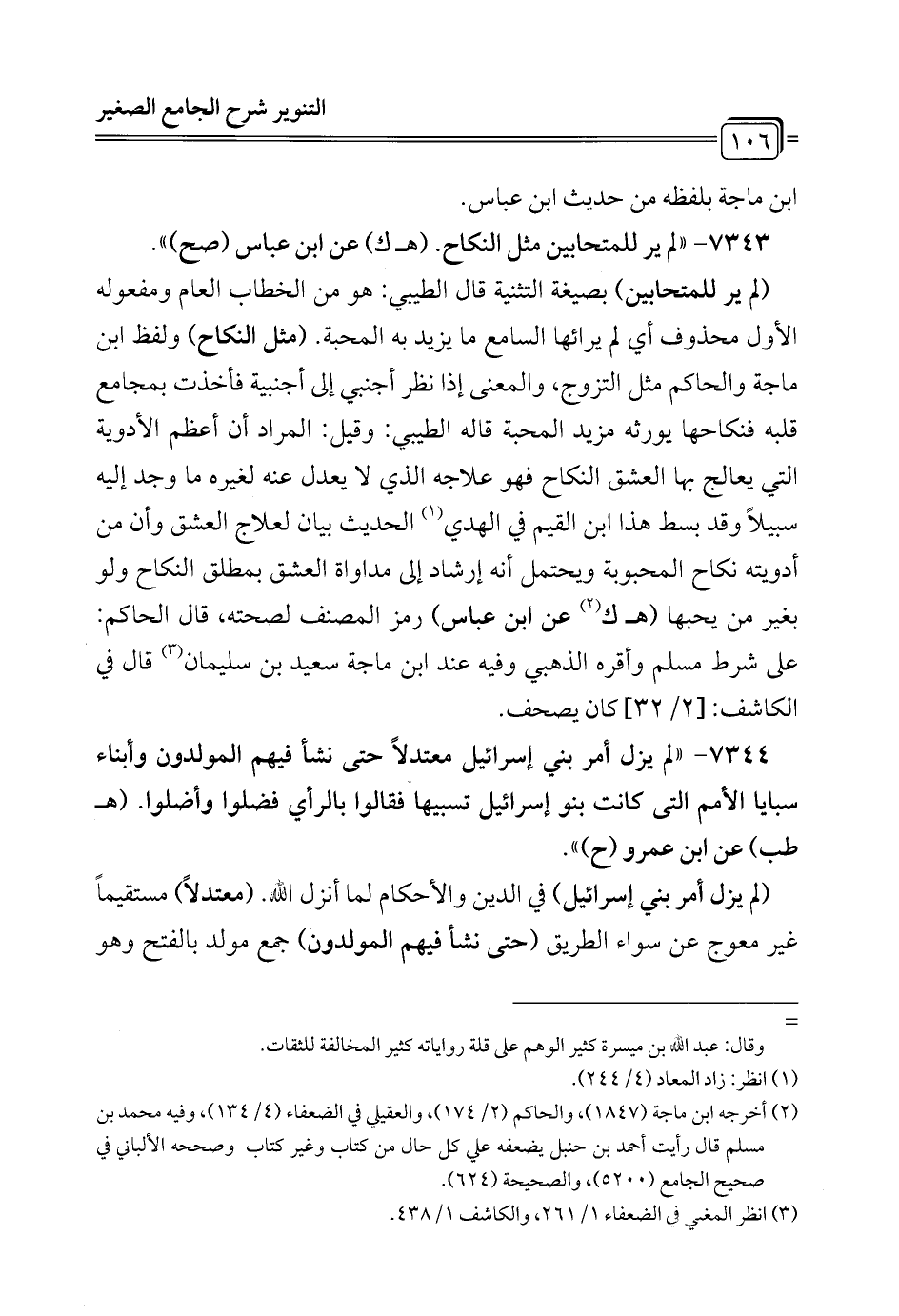 7343 - "لم ير للمتحابين مثل النكاح. (هـ ك) عن ابن عباس (صح) ".