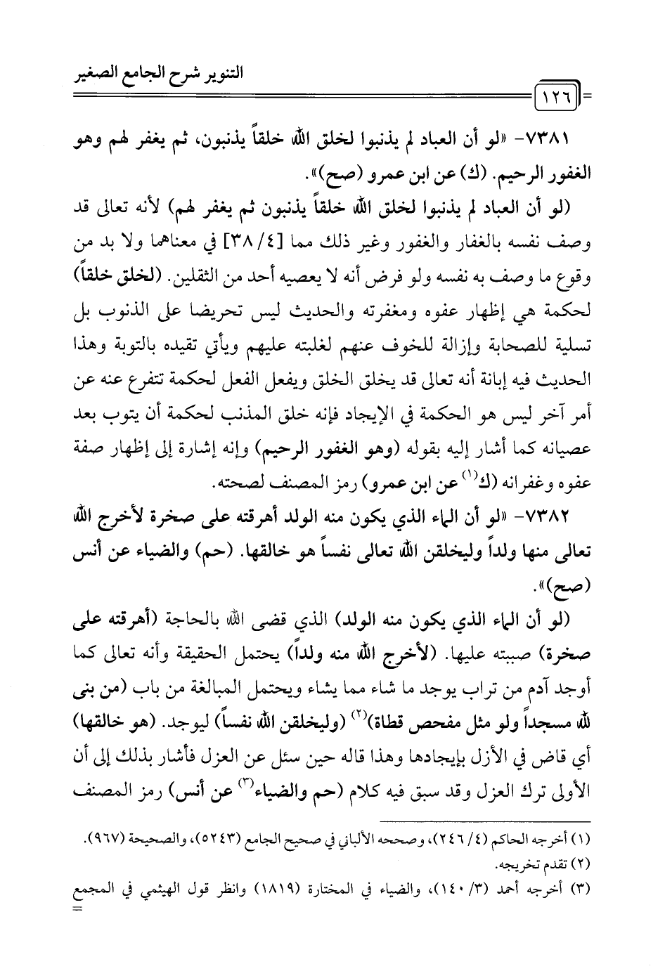 7381 - "لو أن العباد لم يذنبوا لخلق الله خلقاً يذنبون، ثم يغفر لهم وهو الغفور الرحيم. (ك) عن ابن عمرو (صح) ".