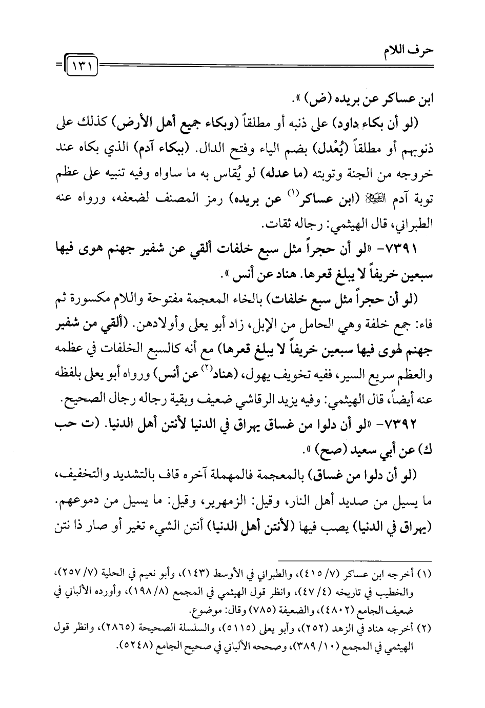 7391 - "لو أن حجراً مثل سبع خلفات ألقي عن شفير جهنم هوى فيها سبعين خريفاً لا يبلغ قعرها. هناد عن أنس".