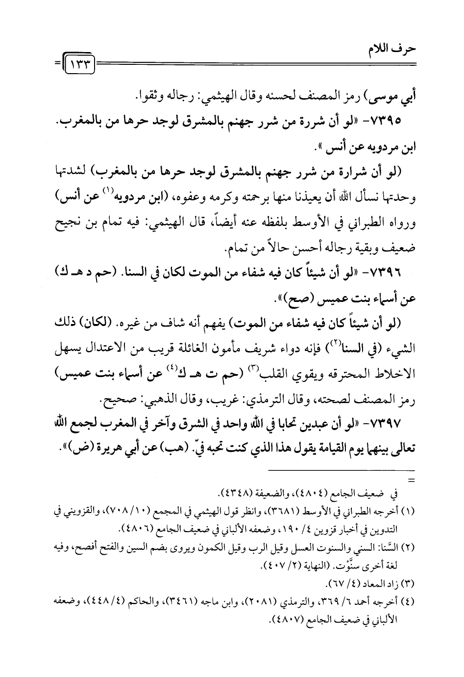 7395 - "لو أن شررة من شرر جهنم بالمشرق لوجد حرها من بالمغرب. ابن مردويه عن أنس".