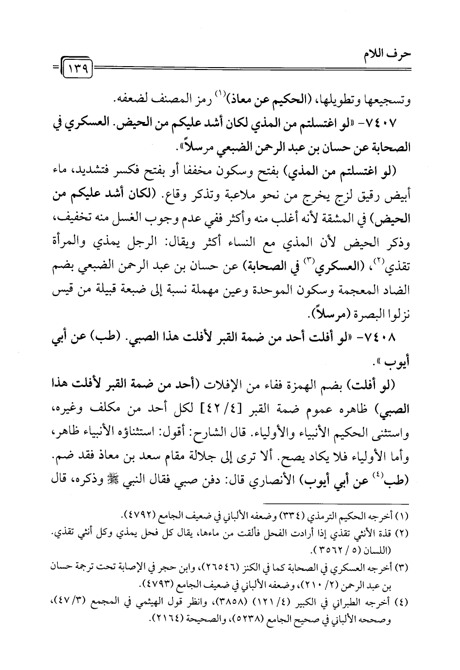 7407 - "لو اغتسلتم من المذي لكان أشد عليكم من الحيض. العسكري في الصحابة عن حسان بن عبد الرحمن الضبعي مرسلاً".