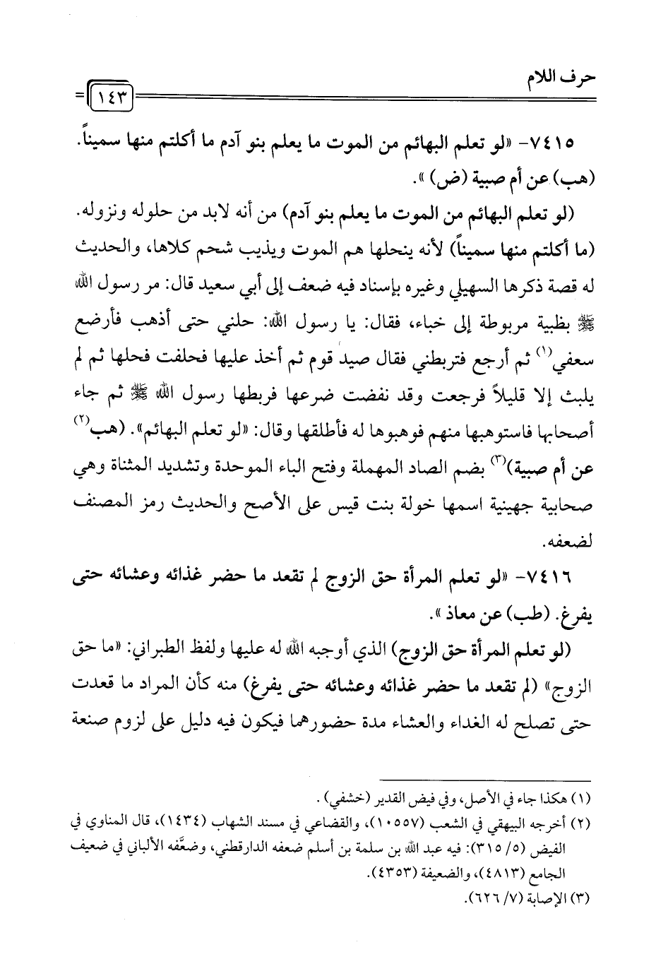 7415 - "لو تعلم البهائم من الموت ما يعلم بنو آدم ما أكلتم منها سميناً. (هب) عن أم صبية (ض) ".