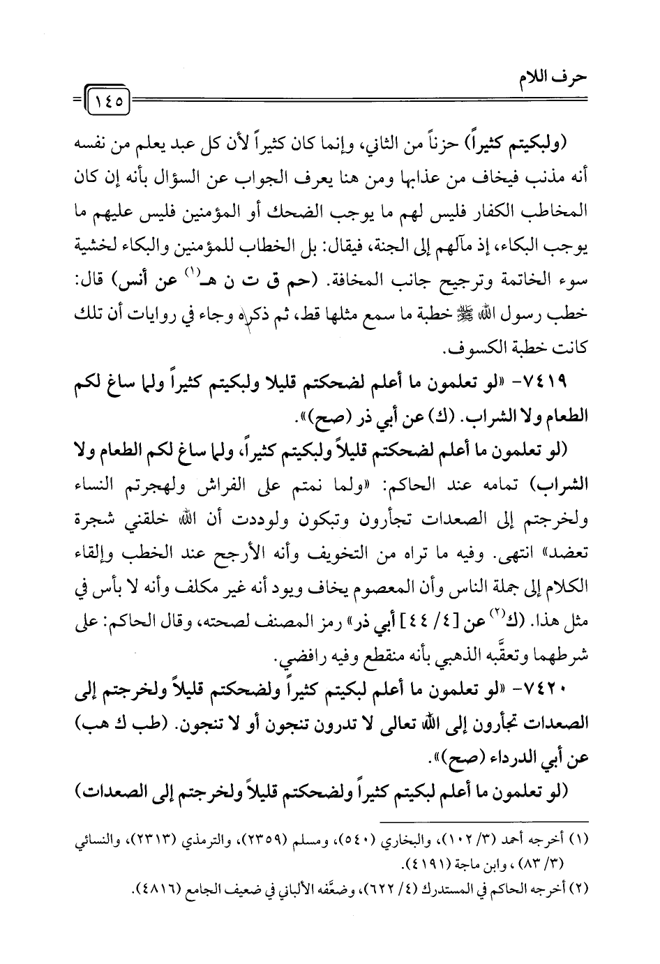7419 - "لو تعلمون ما أعلم لضحكتم قليلًا ولبكيتم كثيرًا ولما ساغ لكم الطعام ولا الشراب. (ك) عن أبي ذر (صح) ".