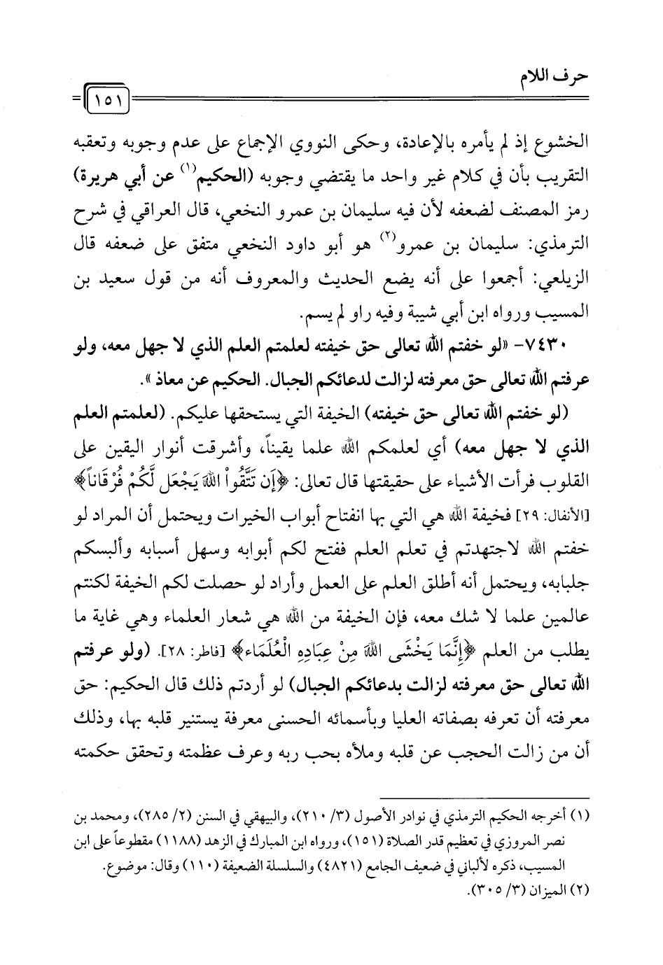 7430 - "لو خفتم الله تعالى حق خيفته لعلمتم العلم الذي لا جهل معه، ولو عرفتم الله تعالى حق معرفته لزالت لدعائكم الجبال. الحكيم عن معاذ".