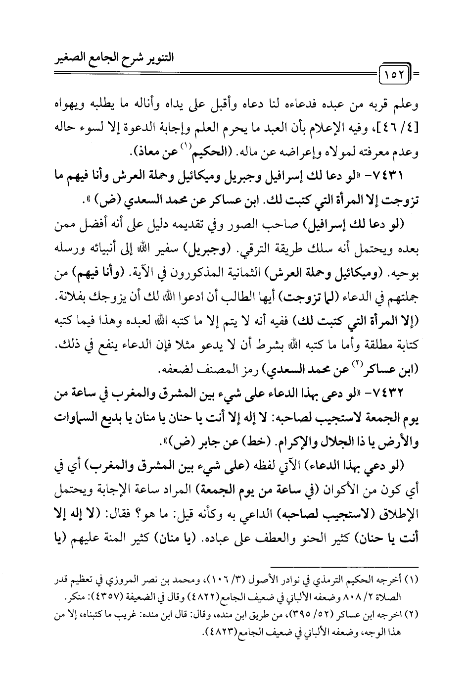 7432 - "لو دعى بهذا الدعاء على شيء بين المشرق والمغرب في ساعة من يوم الجمعة لاستجيب لصاحبه: لا إله إلا أنت يا حنان يا منان يا بديع السماوات والأرض يا ذا الجلال والإكرام. (خط) عن جابر (ض) ".