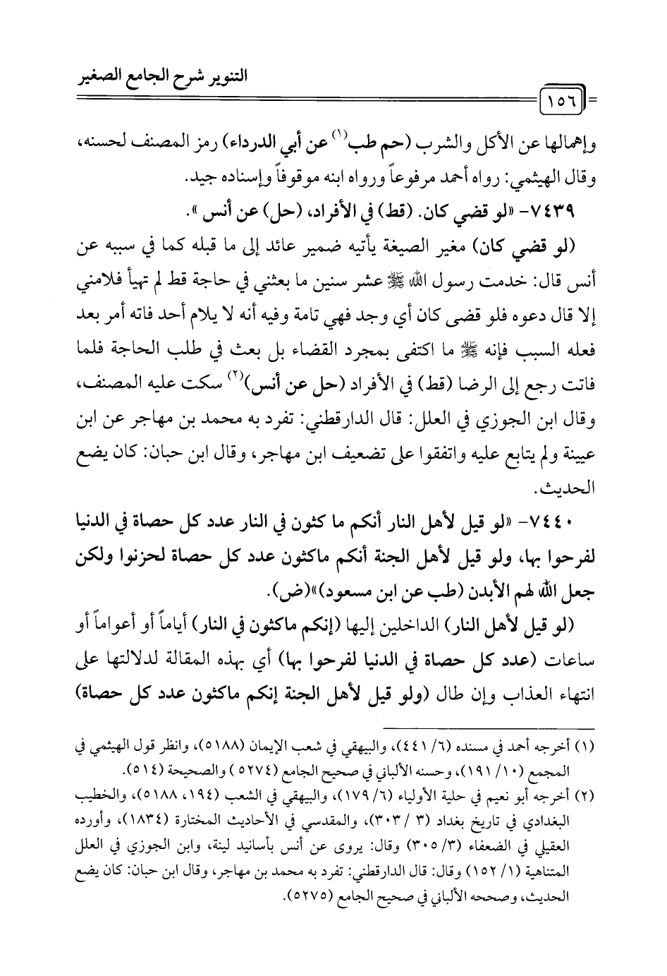 (¬2) أخرجه أبو نعيم في حلية الأولياء (6/ 179)، والبيهقي في الشعب (194، 5188)، والخطيب البغدادي في تاريخ بغداد (3/ 303)، والمقدسي في الأحاديث المختارة (1834)، وأورده العقيلي في الضعفاء (3/ 305) وقال: يروى عن أنس بأسانيد لينة، وابن الجوزي في العلل المتناهية (1/ 152) وقال: قال الدارقطني: تفرد به محمَّد بن مهاجر، وقال ابن حبان: كان يضع الحديث، وصححه الألباني في صحيح الجامع (5275).