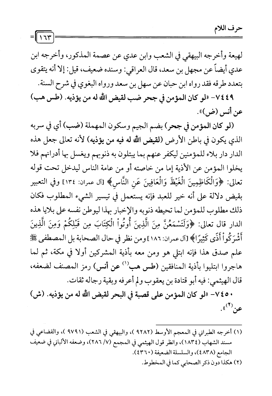 7449 - "لو كان المؤمن في جحر ضب لقيض الله له من يؤذيه. (طس هب) عن أنس (ض) ".