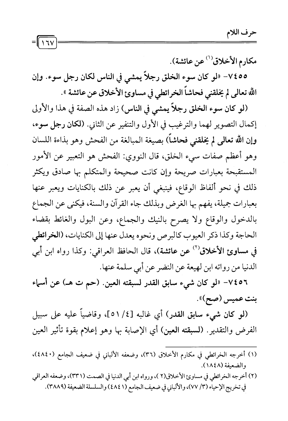 7455 - "لو كان سوء الخلق رجلاً يمشي في الناس لكان رجل سوء. وإن الله تعالى لم يخلقني فحاشاً الخرائطي في مساوئ الأخلاق عن عائشة".