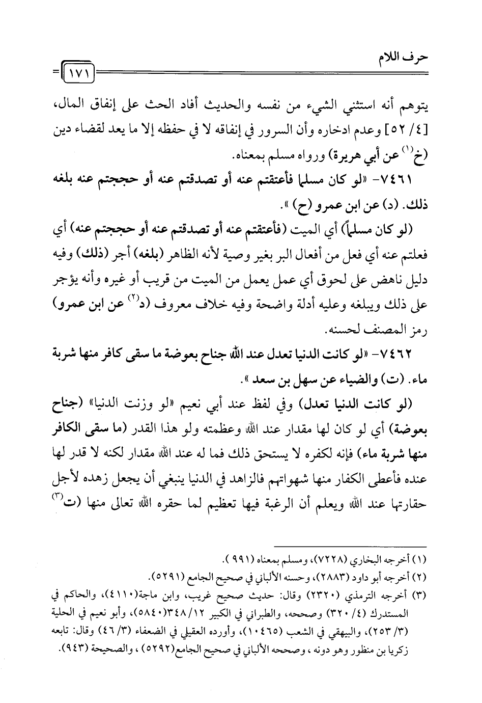 7461 - "لو كان مسلما فأعتقتم عنه أو تصدقتم عنه أو حججتم عنه بلغه ذلك. (د) عن ابن عمرو (ح) ".