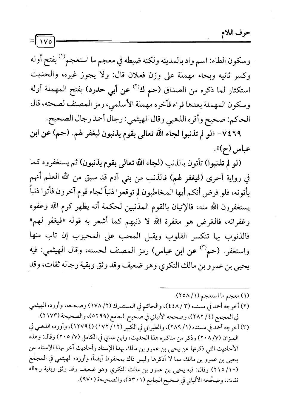 (¬3) أخرجه أحمد في مسنده (1/ 289)، والطبراني في الكبير (12/ 172) (12794)، وأورده الذهبي في الميزان (7/ 208) وذكر من مناكيره هذا الحديث، وابن عدي في الكامل (7/ 205) وقال: وهذه الأحاديث التي ذكرتها عن يحيى بن عمرو بن مالك بهذا الإسناد وأحاديث آخر بهذا الإسناد عن يحيى بن عمرو بن مالك مما لا أذكرها وليس ذاك بمحفوظ أيضًا، وأورده الهيثمي في المجمع (10/ 215) وقال: فيه يحيى بن عمرو بن مالك النكري وهو ضعيف وقد وثق وبقية رجاله ثقات، وصحَّحه الألباني في صحيح الجامع (5301)، والصحيحة (970).