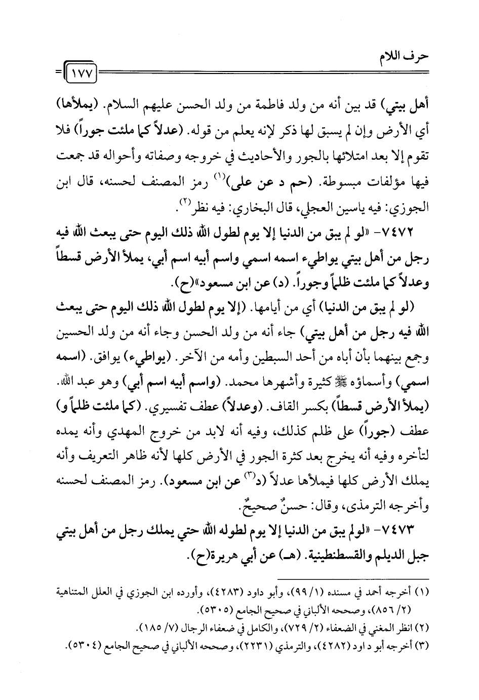7472 - "لو لم يبق من الدنيا إلا يوم لطول الله ذلك اليوم حتى يبعث الله فيه رجل من أهل بيتي يواطئ اسمه اسمي واسم أبيه اسم أبي، يملأ الأرض قسطاً وعدلاً كما ملئت ظلماً وجوراً. (د) عن ابن مسعود" (ح).