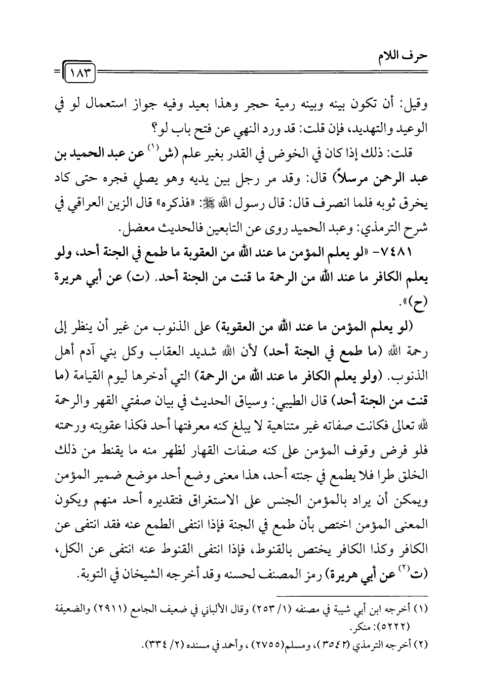 7481 - "لو يعلم المؤمن ما عند الله من العقوبة ما طمع في الجنة أحد، ولو يعلم الكافر ما عند الله من الرحمة ما قنت من الجنة أحد. (ت) عن أبي هريرة (ح) ".