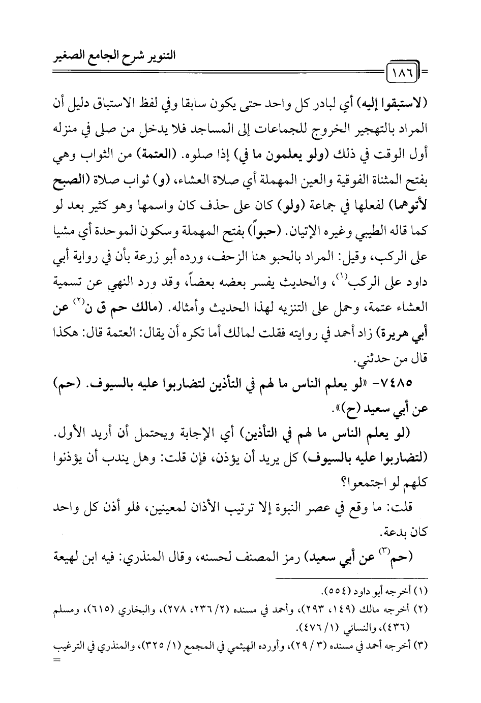 (لاستبقوا إليه) أي لبادر كل واحد حتى يكون سابقا وفي لفظ الاستباق دليل أن المراد بالتهجير الخروج للجماعات إلى المساجد فلا يدخل من صلى في منزله أول الوقت في ذلك (ولو يعلمون ما في) إذا صلوه. (العتمة) من الثواب وهي بفتح المثناة الفوقية والعين المهملة أي صلاة العشاء، (و) ثواب صلاة (الصبح لأتوهما) لفعلها في جماعة (ولو) كان على حذف كان واسمها وهو كثير بعد لو كما قاله الطيبي وغيره الإتيان. (حبواً) بفتح المهملة وسكون الموحدة أي مشيا على الركب، وقيل: المراد بالحبو هنا الزحف، ورده أبو زرعة بأن في رواية أبي داود على الركب (¬1)، والحديث يفسر بعضه بعضاً، وقد ورد النهي عن تسمية العشاء عتمة، وحمل على التنزيه لهذا الحديث وأمثاله. (مالك حم ق ن (¬2) عن أبي هريرة) زاد أحمد في روايته فقلت لمالك أما تكره أن يقال: العتمة قال: هكذا قال من حدثني.