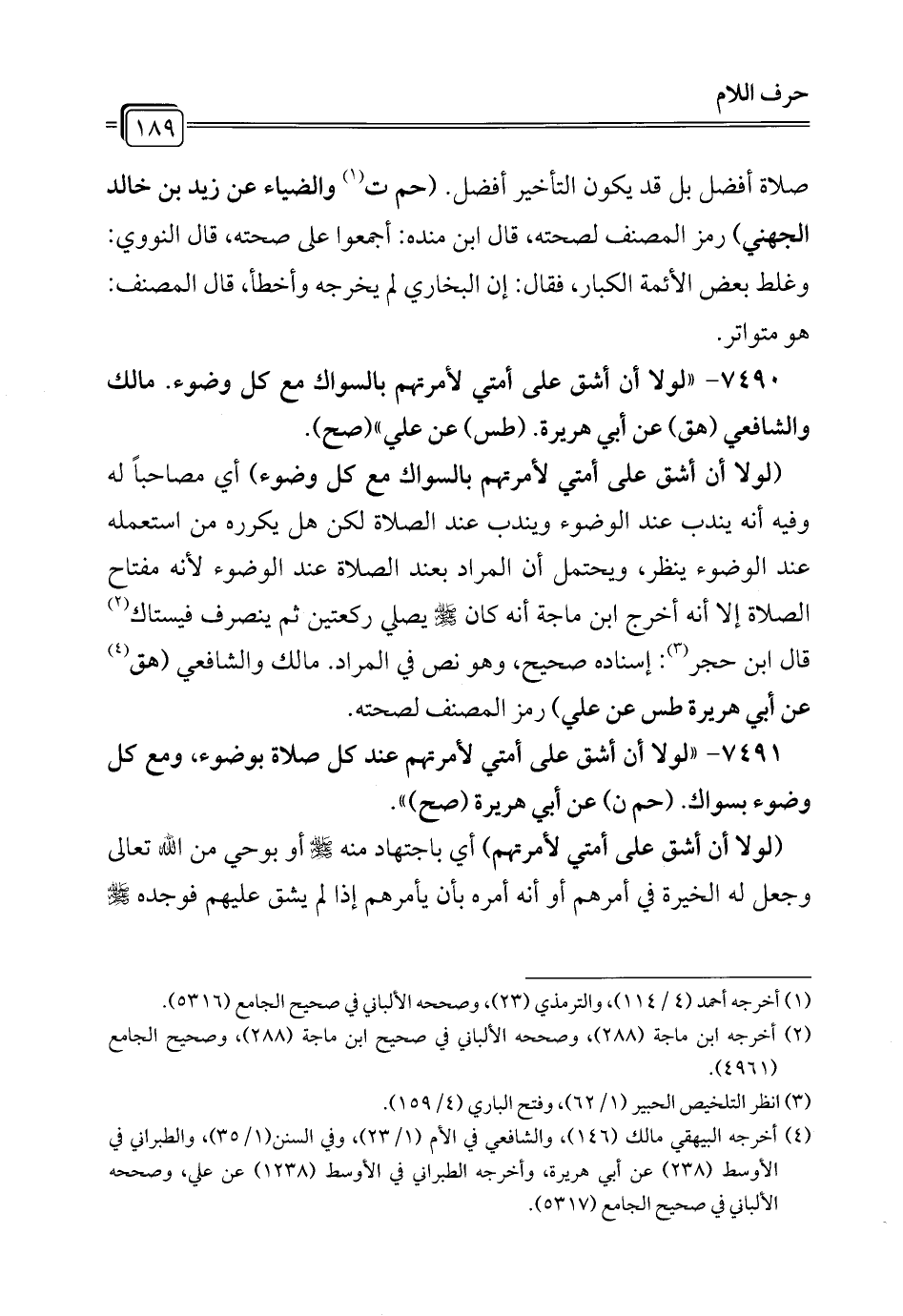 7491 - "لولا أن أشق على أمتي لأمرتهم عند كل صلاة بوضوء، ومع كل وضوء بسواك. (حم ن) عن أبي هريرة (صح) ".