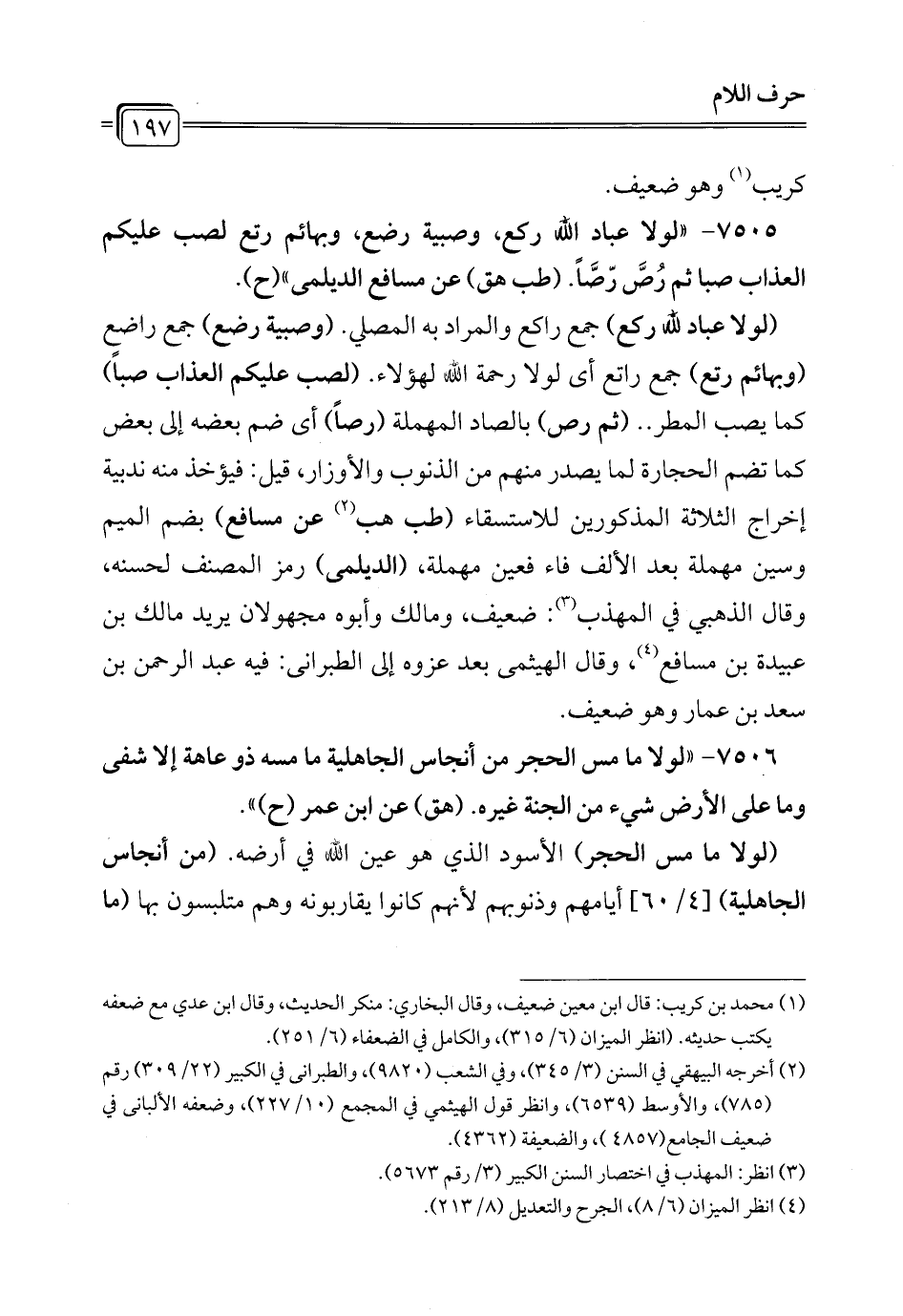 7505 - "لولا عباد الله ركع، وصبية رضع، وبهائم رتع لصب عليكم العذاب صبا ثم رُصَّ رّصًّا. (طب هق) عن مسافع الديلمى" (ح).