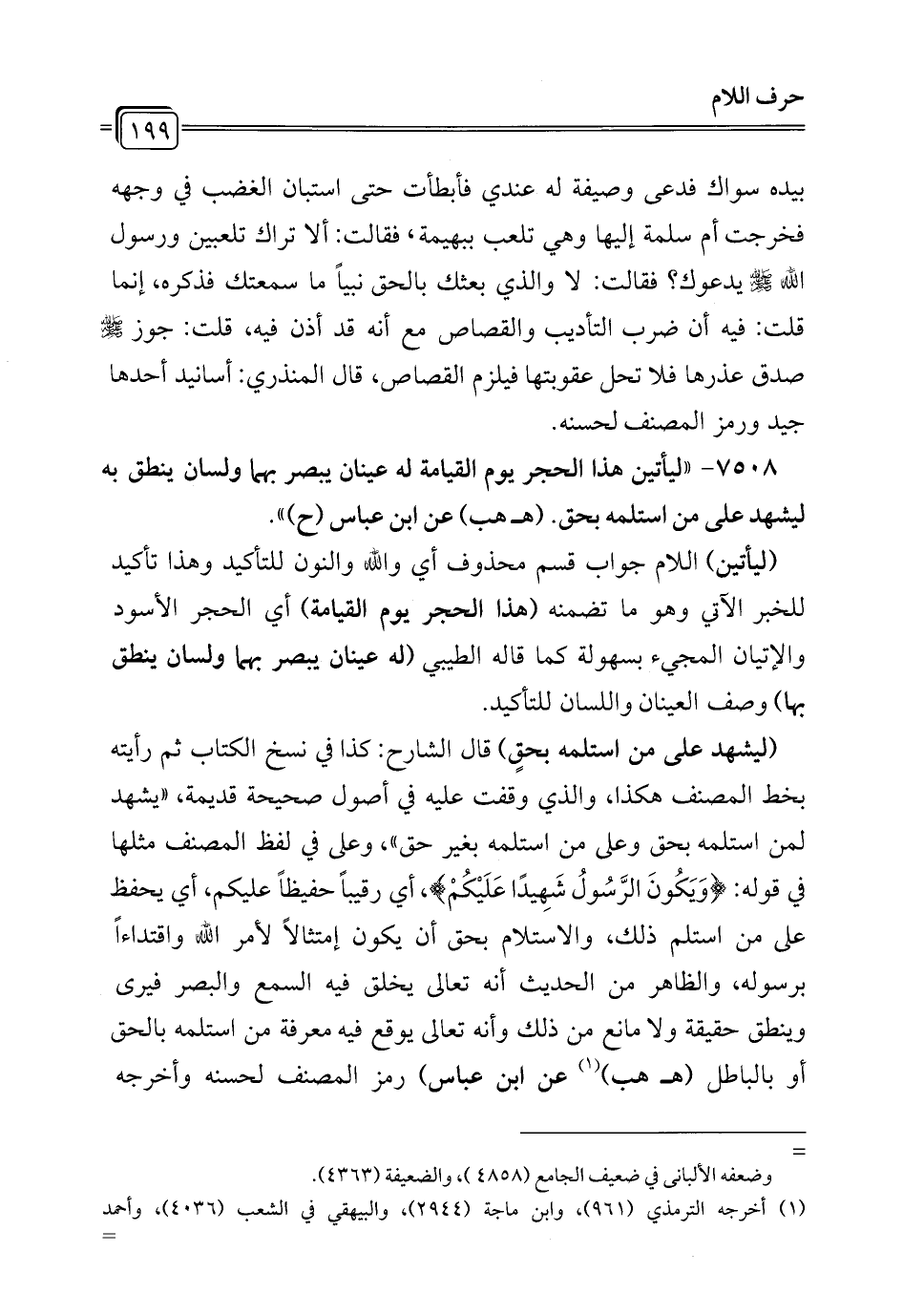 7508 - "ليأتين هذا الحجر يوم القيامة له عينان يبصر بهما ولسان ينطق به ليشهد على من استلمه بحق. (هـ هب) عن ابن عباس (ح) ".