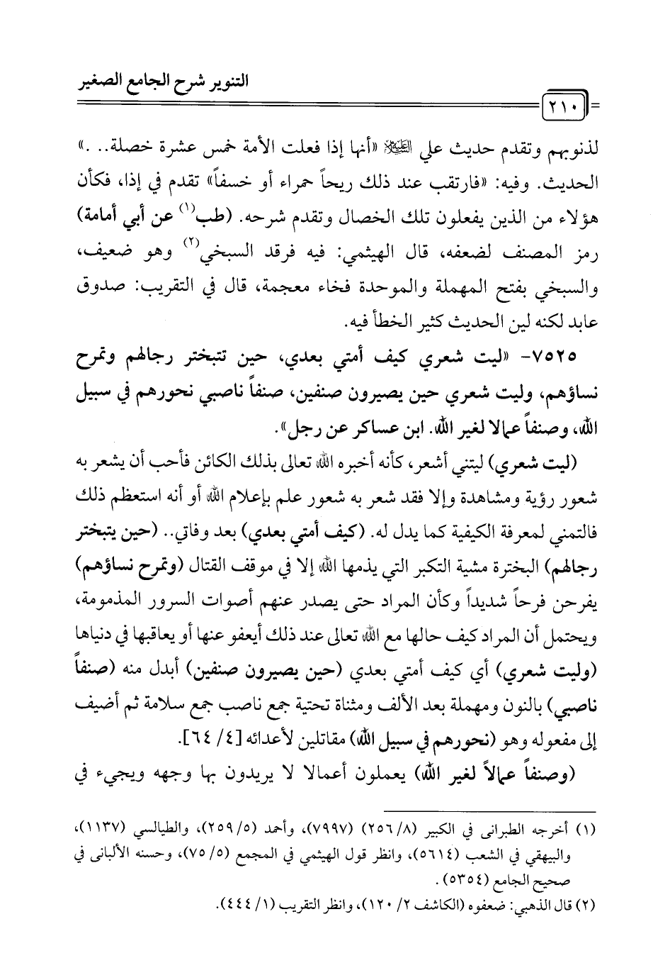 7525 - "ليت شعري كيف أمتي بعدي، حين تتبختر رجالهم وتمرح نساؤهم، وليت شعري حين يصيرون صنفين، صنفاً ناصبي نحورهم في سبيل الله، وصنفاً عمالا لغير الله. ابن عساكر عن رجل".