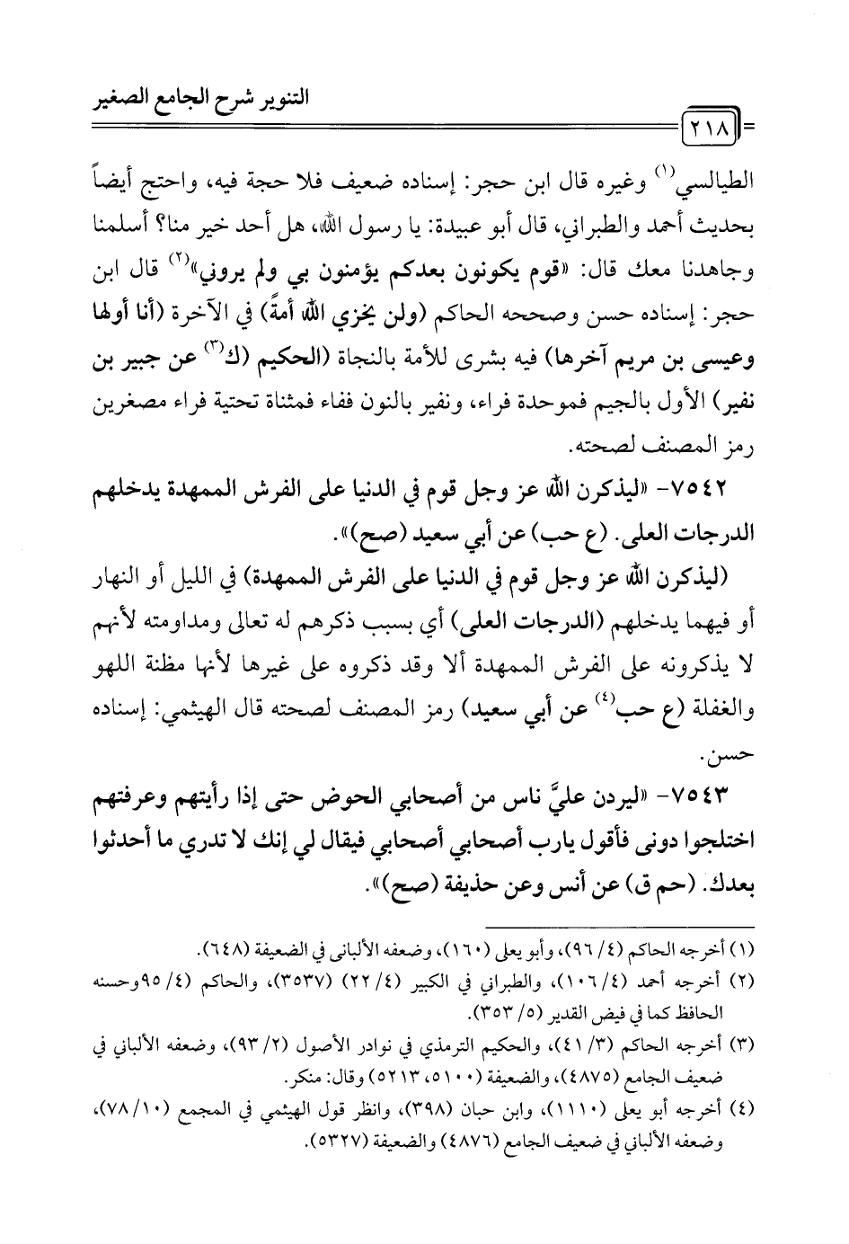 7542 - "ليذكرن الله عز وجل قوم في الدنيا على الفرش الممهدة يدخلهم الدرجات العلى. (ع حب) عن أبي سعيد (صح) ".