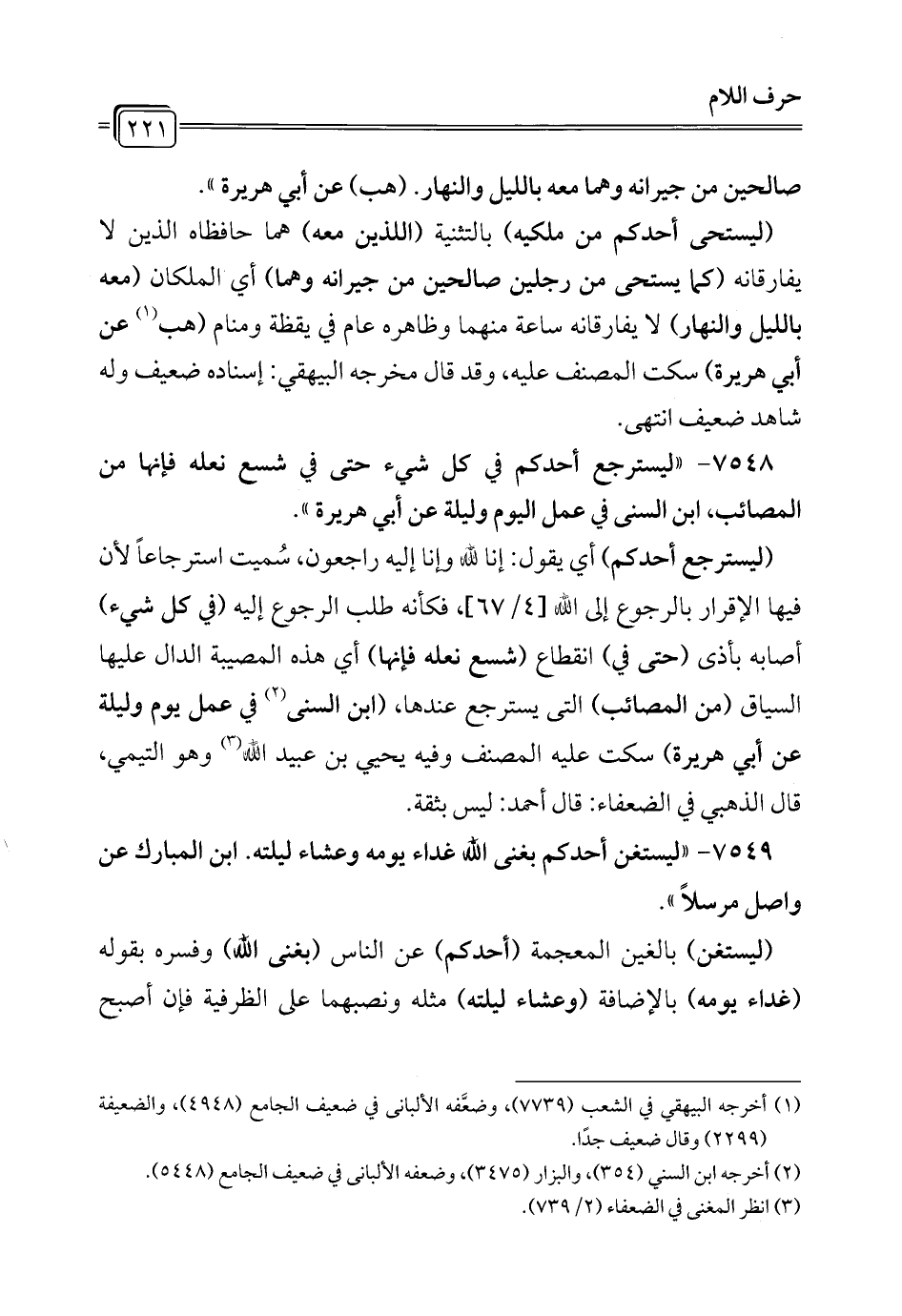 7548 - "ليسترجع أحدكم في كل شيء حتى في شسع نعله فإنها من المصائب، ابن السنى في عمل اليوم وليلة عن أبي هريرة".