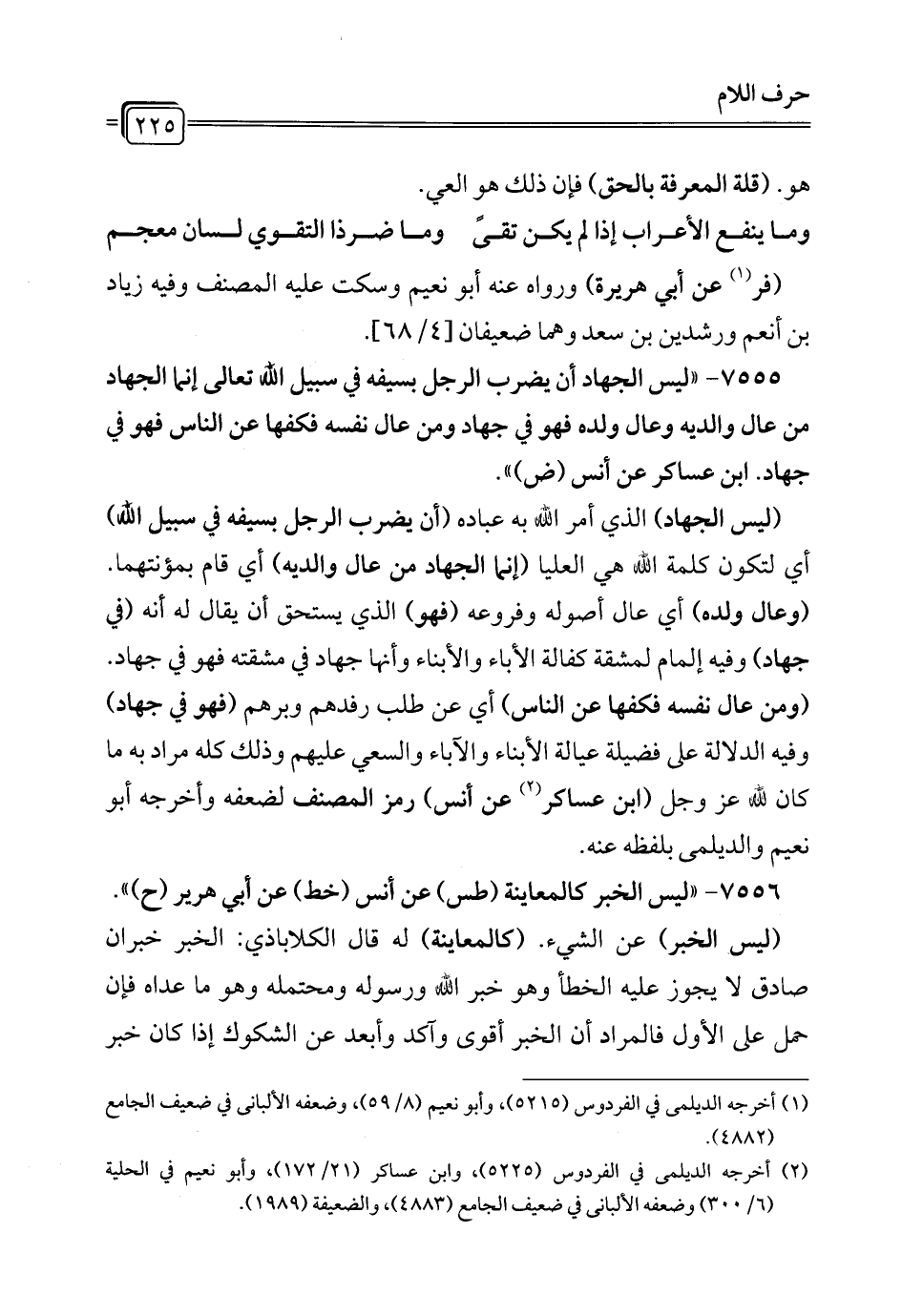 (¬2) أخرجه الديلمى في الفردوس (5225)، وابن عساكر (21/ 172)، وأبو نعيم في الحلية (6/ 300) وضعفه الألباني في ضعيف الجامع (4883)، والضعيفة (1989).