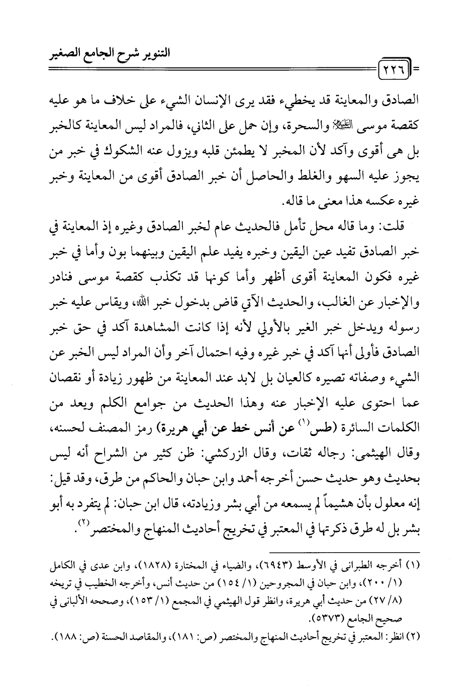 الصادق والمعاينة قد يخطئ فقد يرى الإنسان الشيء على خلاف ما هو عليه كقصة موسى عليه السلام والسحرة، وإن حمل على الثاني، فالمراد ليس المعاينة كالخبر بل هى أقوى وآكد لأن المخبر لا يطمئن قلبه ويزول عنه الشكوك في خبر من يجوز عليه السهو والغلط والحاصل أن خبر الصادق أقوى من المعاينة وخبر غيره عكسه هذا معنى ما قاله.