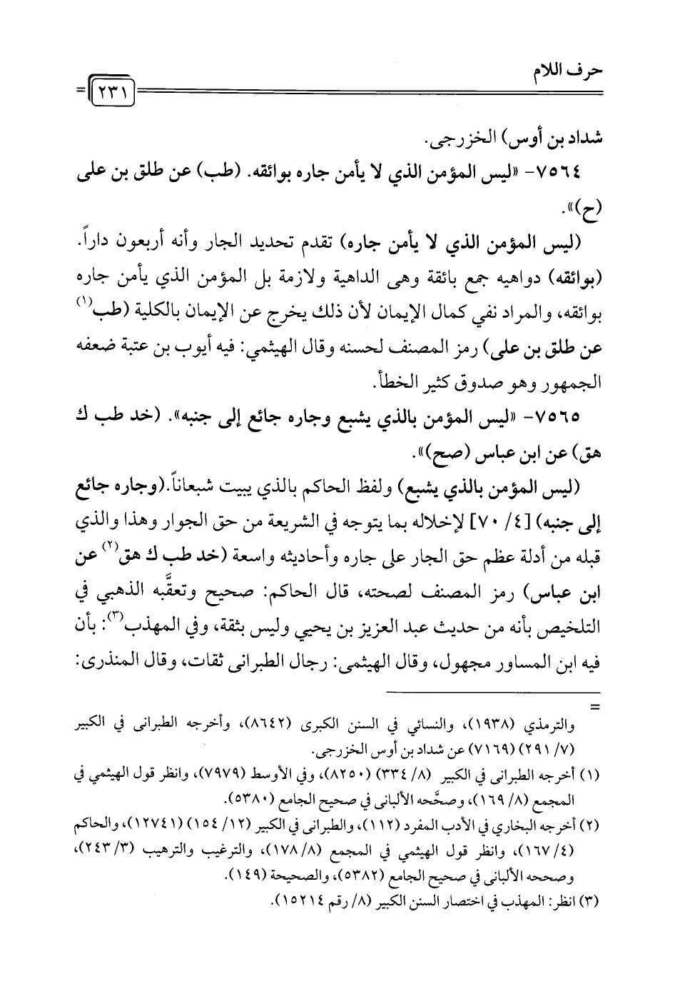 7564 - "ليس المؤمن الذي لا يأمن جاره بوائقه. (طب) عن طلق بن علي (ح) ".