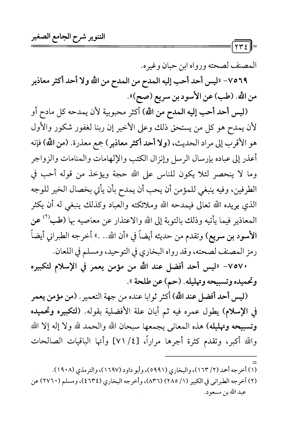 7569 - "ليس أحد أحب إليه المدح من المدح من الله ولا أحد أكثر معاذير من الله. (طب) عن الأسود بن سريع (صح) ".