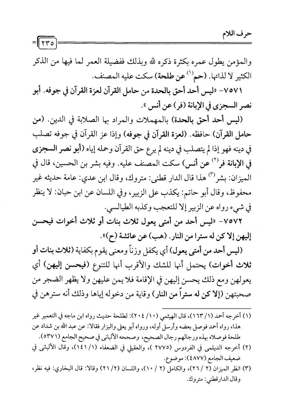 7571 - "ليس أحد أحق بالحدة من حامل القرآن لعزة القرآن في جوفه. أبو نصر السجزى في الإبانة (فر) عن أنس".