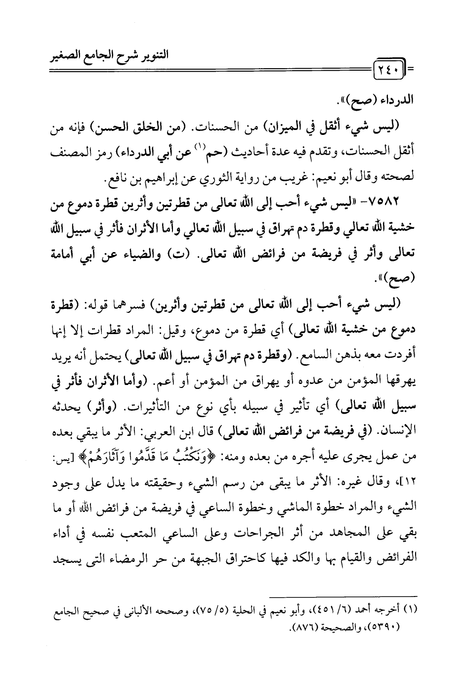 7582 - "ليس شيء أحب إلى الله تعالى من قطرتين وأثرين قطرة دموع من خشية الله تعالى وقطرة دم تهراق في سبيل الله تعالى وأما الأثران فأثر في سبيل الله تعالى وأثر في فريضة من فرائض الله تعالى. (ت) والضياء عن أبي أمامة (صح) ".