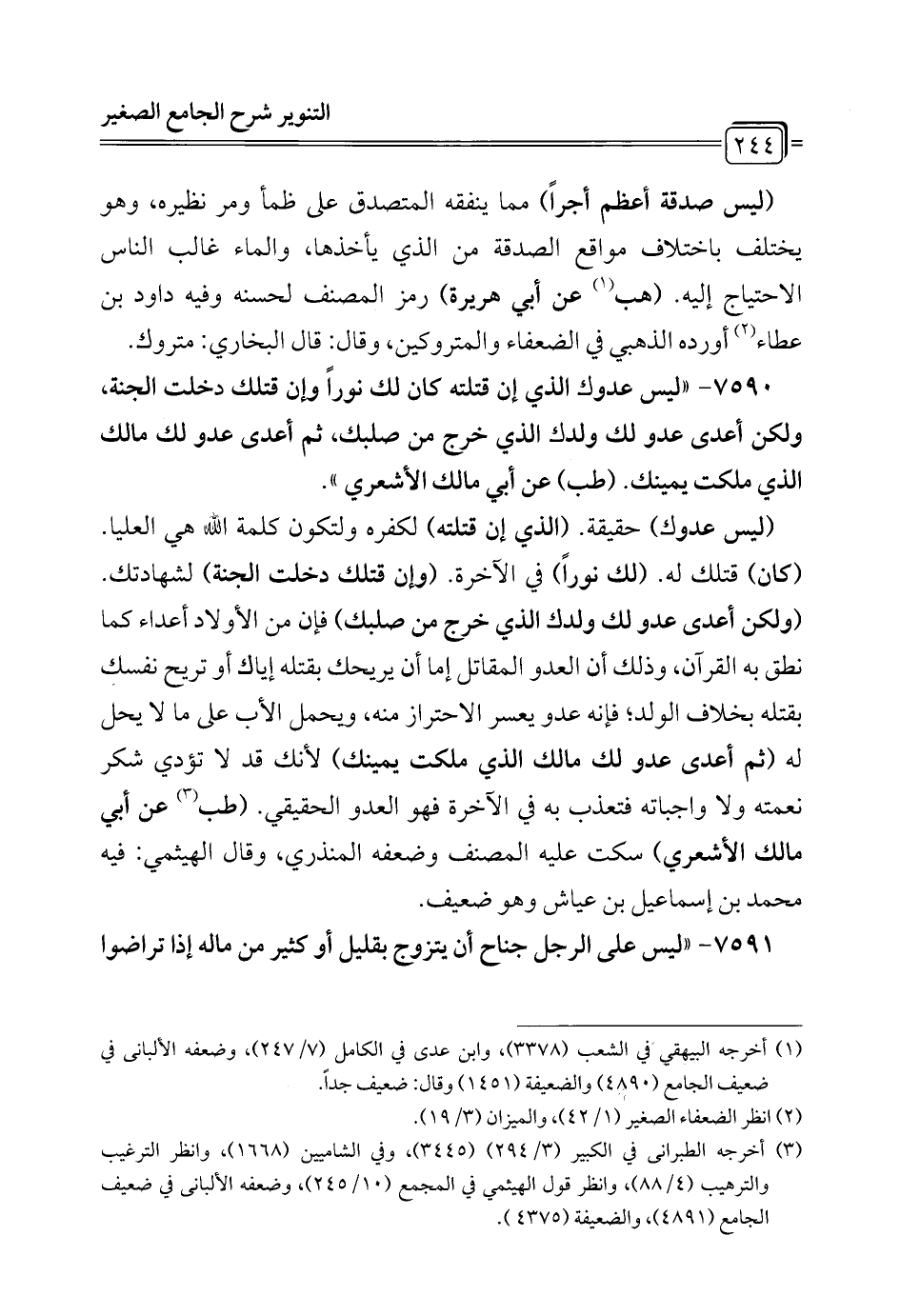 7590 - "ليس عدوك الذي إن قتلته كان لك نوراً وإن قتلك دخلت الجنة، ولكن أعدى عدو لك ولدك الذي خرج من صلبك، ثم أعدى عدو لك مالك الذي ملكت يمينك. (طب) عن أبي مالك الأشعري".